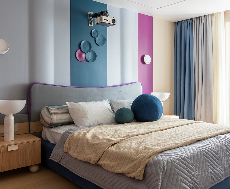 Детали интерьера бережно, но ненавязчиво напоминают о том,что герои любят спорт (через волнообразную, плавную геометрию интерьера – отсыл к волнам или элементы интерьера в виде подушек-шаров, круглых ножек прикроватных тумб или пуфика перед кроватью, напоминающих про футбол)
