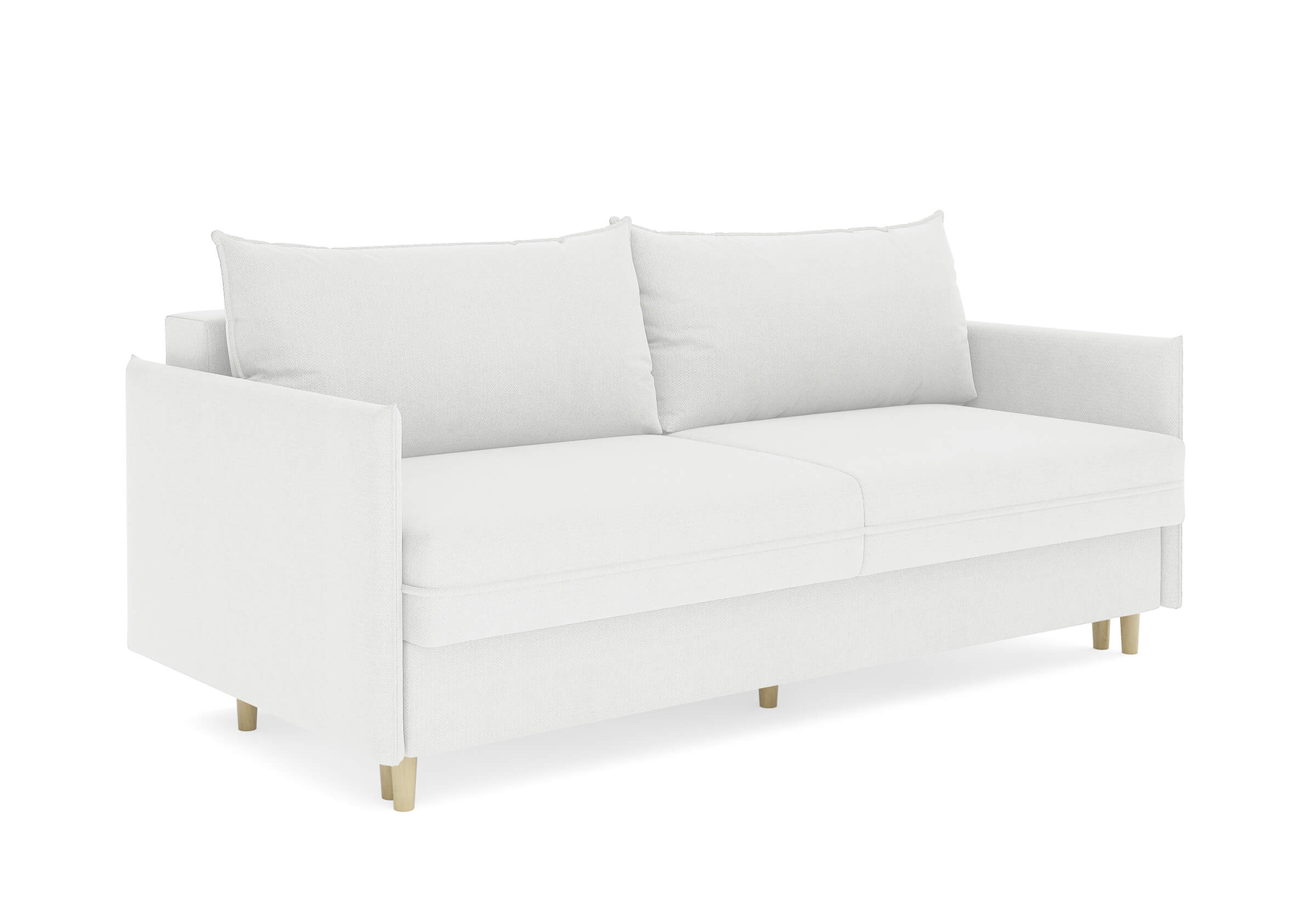 Диван для сна в скандинавском стиле с механизмом трансформации пантограф и коробом для хранения. Модель без броского декора, с прямыми линиями. Благодаря декоративному канту на сидении, подлокотниках и подушках, а также опорам из натурального массива Rain органично впишется в современные интерьеры в скандинавском стиле. У дивана анатомический матрас с блоком независимых пружин, жесткость средняя. Тонкие подлокотники делают диван негабаритным в длину. Комфортная глубина и высота сиденья обеспечит ежедневный комфорт. Задняя спинка предотвращает загрязнение и повреждение стены. В основе мягких подушек – микс наполнителей: поролоновая крошка не дает деформироваться, а синтетическое волокно добавляет комфорт. Опоры деревянные, два цвета на выбор. Просвет над полом способствует легкой уборке под диваном, в том числе роботом-пылесосом..