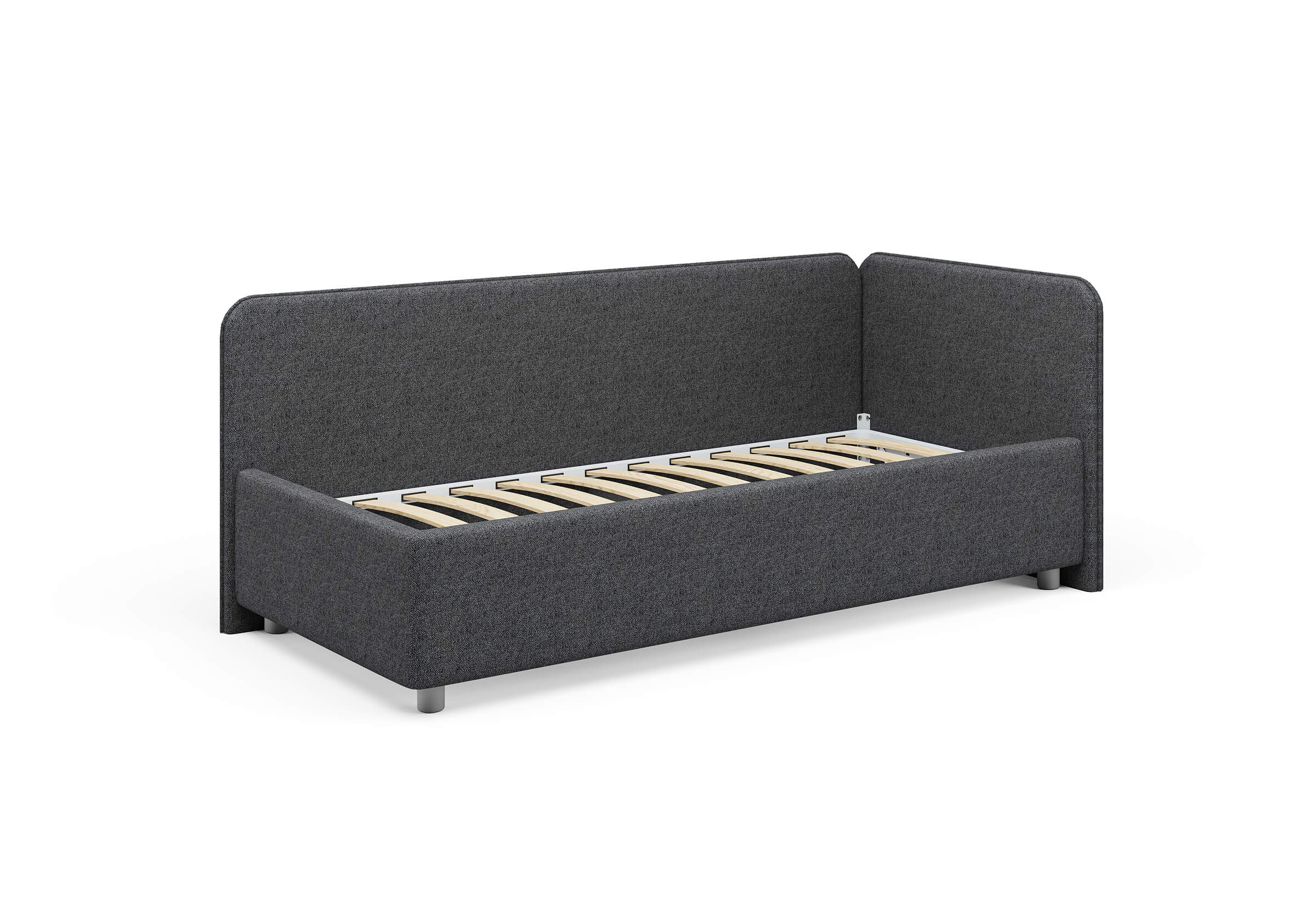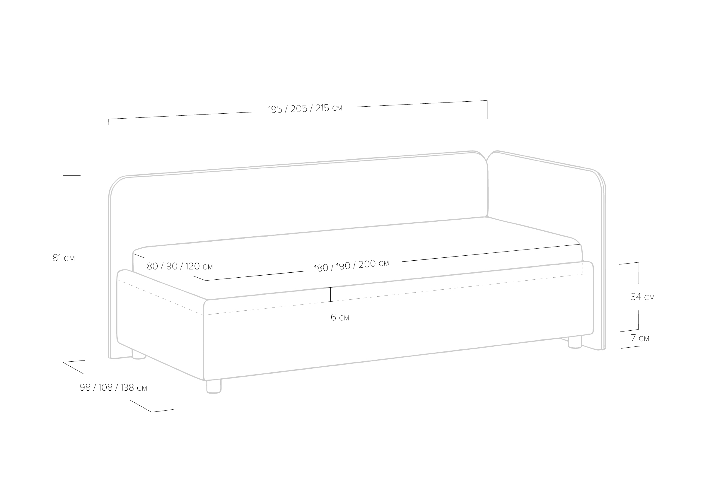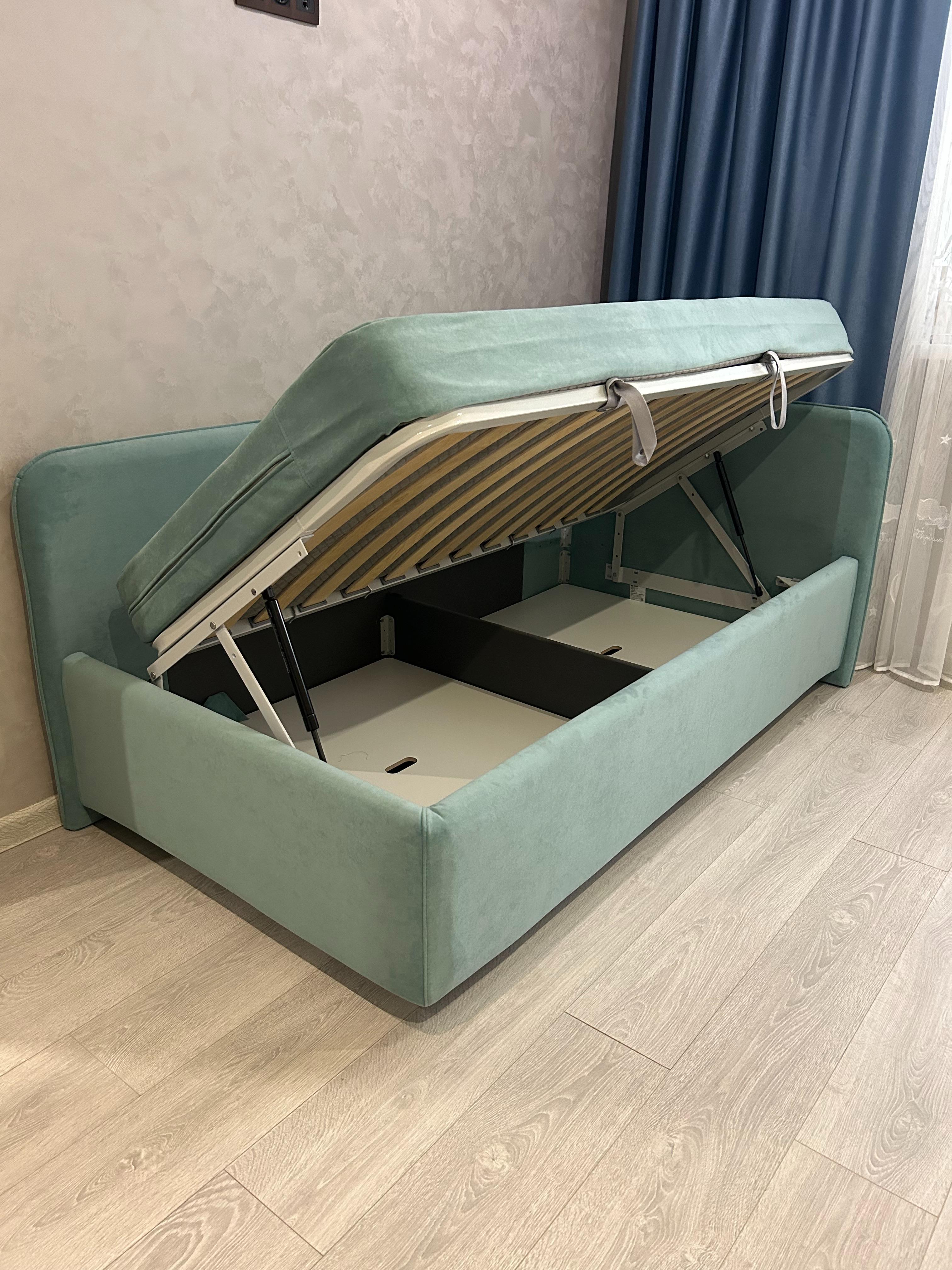 Односпальная кровать в современном стиле. Кровать-софа с одной боковой спинкой. Идеально подходит для квартир с небольшой площадью, детских и подростковых спален, гостевых комнат. Боковую спинку кровати можно изготовить на выбор на правую или левую сторону. Модель изготовлена из ДСП. Дополнительно можно выбрать ортопедическое основание или укомплектовать кровать подъемным механизмом с бельевым ящиком. Каркас основания выполнен из металла, ламели - из берёзы. Данная модель стала героем программы "Квартирный вопрос" на телеканале НТВ. Выпуск можно посмотреть здесь.