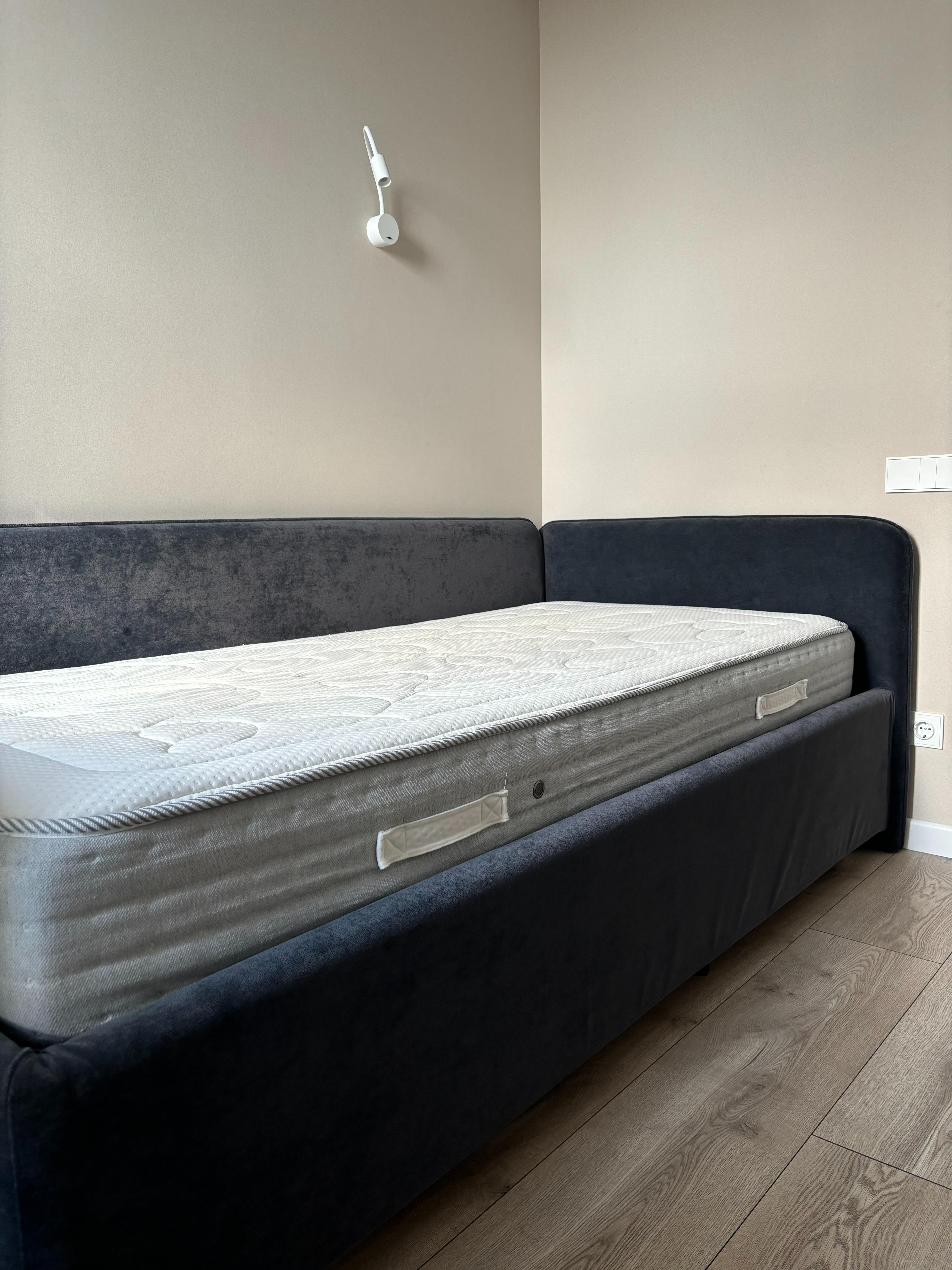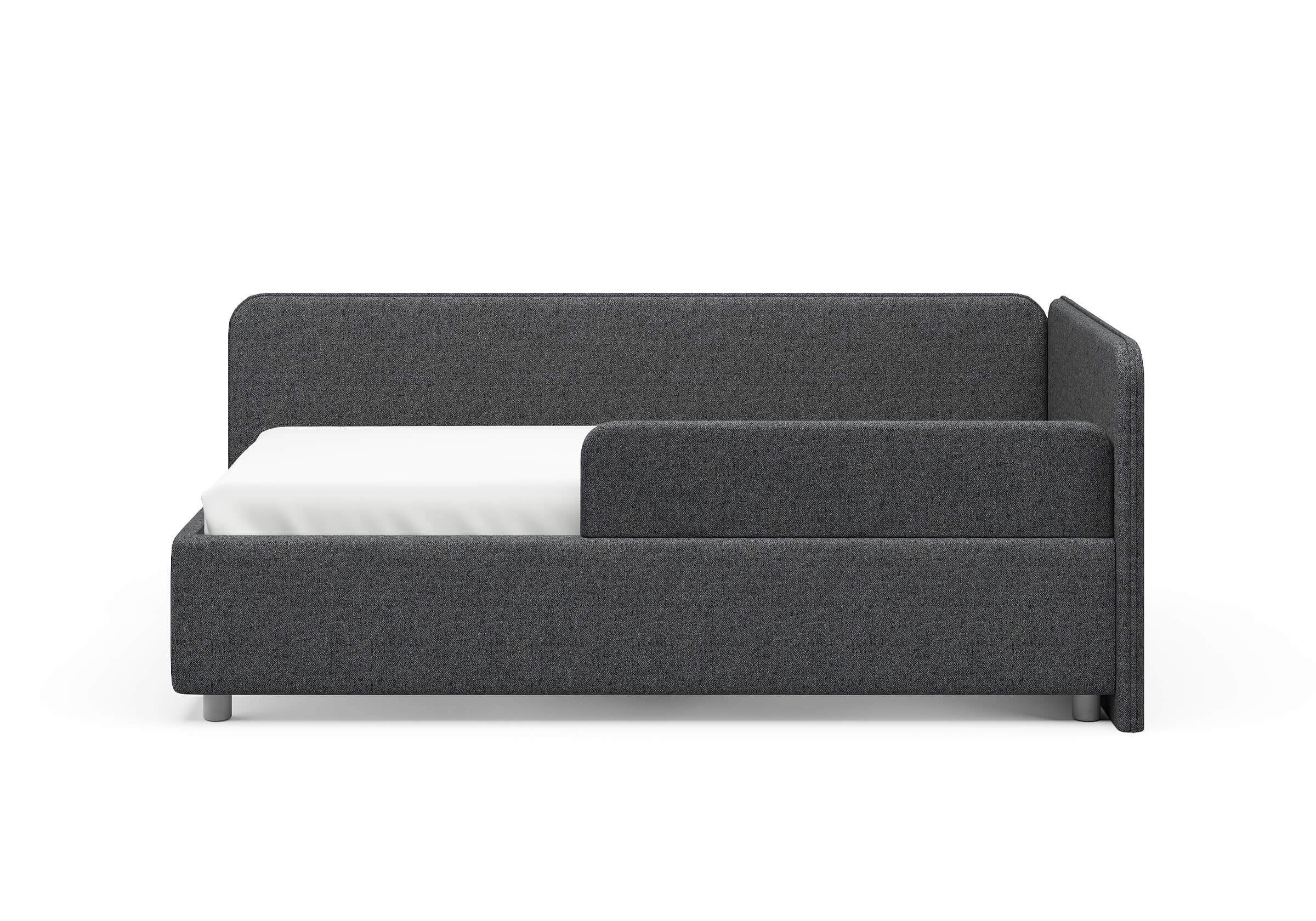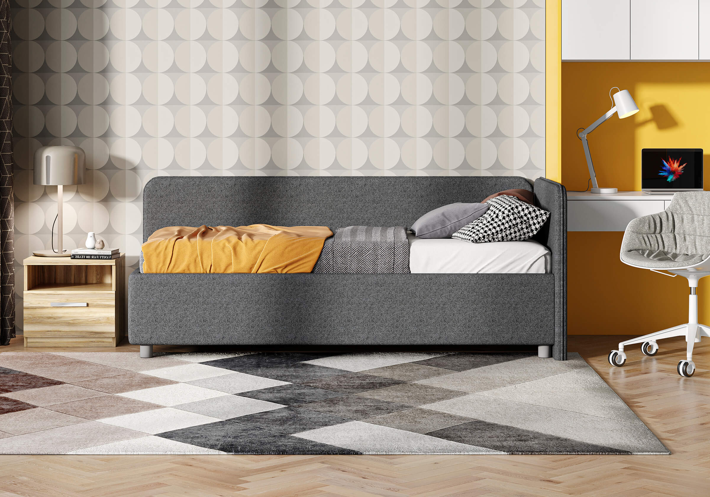 Односпальная кровать в современном стиле. Кровать-софа с одной боковой спинкой. Идеально подходит для квартир с небольшой площадью, детских и подростковых спален, гостевых комнат. Боковую спинку кровати можно изготовить на выбор на правую или левую сторону. Модель изготовлена из ДСП. Дополнительно можно выбрать ортопедическое основание или укомплектовать кровать подъемным механизмом с бельевым ящиком. Каркас основания выполнен из металла, ламели - из берёзы. Данная модель стала героем программы "Квартирный вопрос" на телеканале НТВ. Выпуск можно посмотреть здесь.