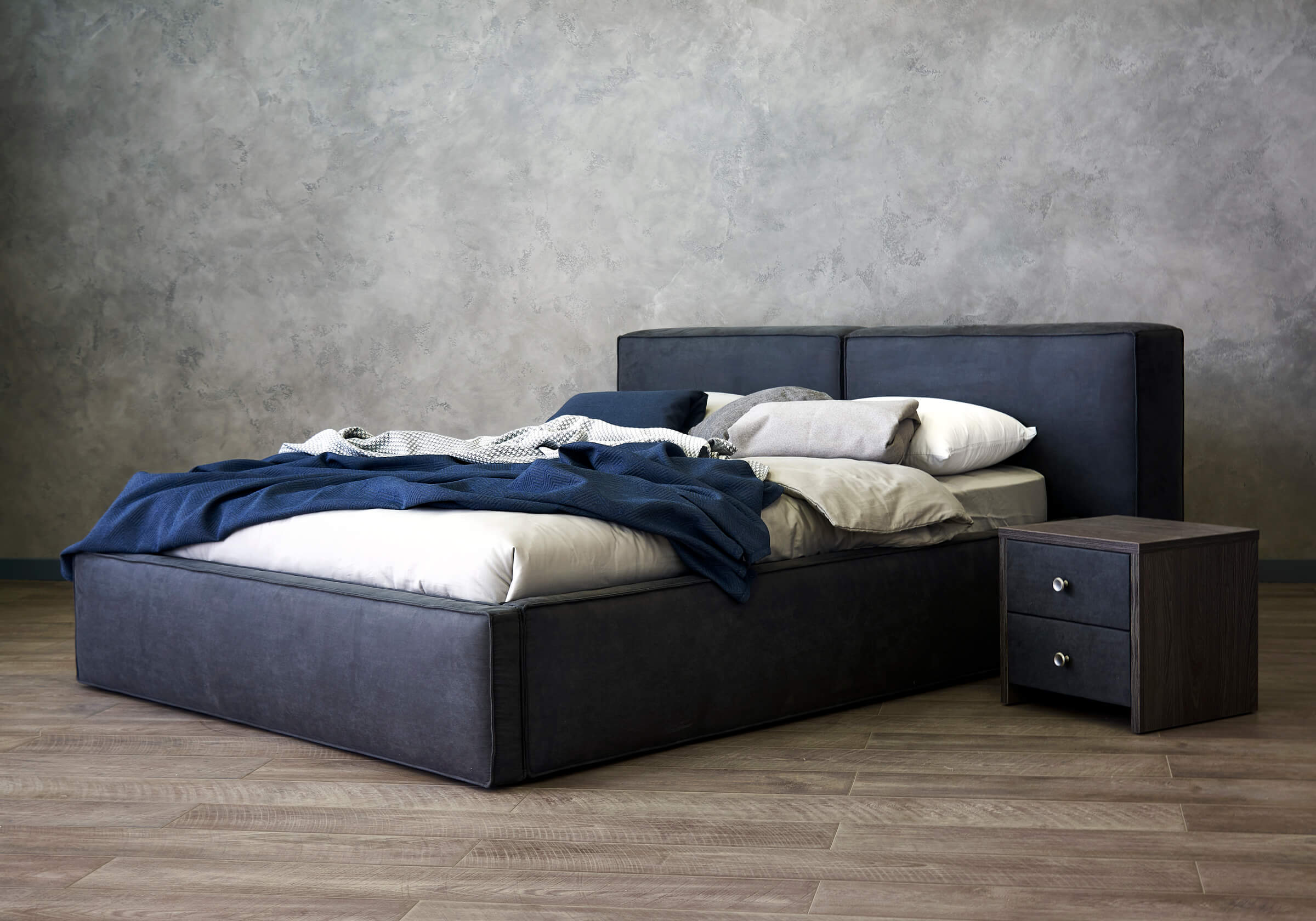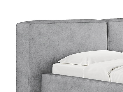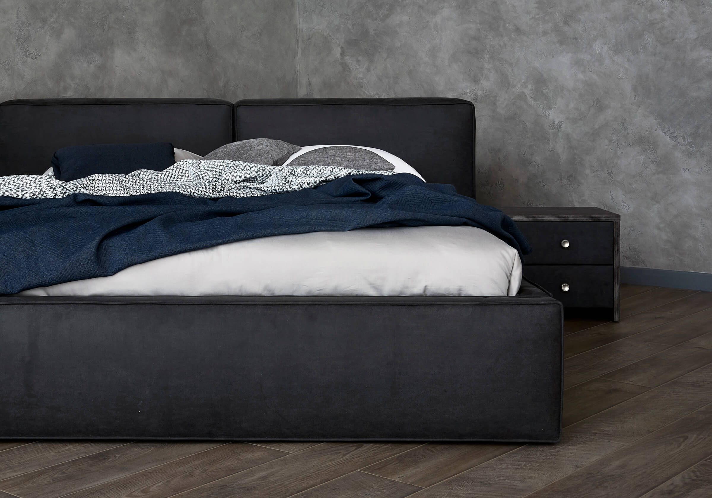 Кровать мягкая по всему периметру, без ножек - можно не бояться удариться мизинчиком) Изголовье в виде двух отдельных подушек с плоским широким верхом, на который можно положить телефон или планшет и не бояться, что ночью упадет на лицо. Дизайн с закосом под лофт, именно как я искал, в интерьер спальни вписался отлично. Сплю чуть больше полу года, за это время минусов не обнаружил. Сейчас вот вернулся за тумбами в том же цвете.