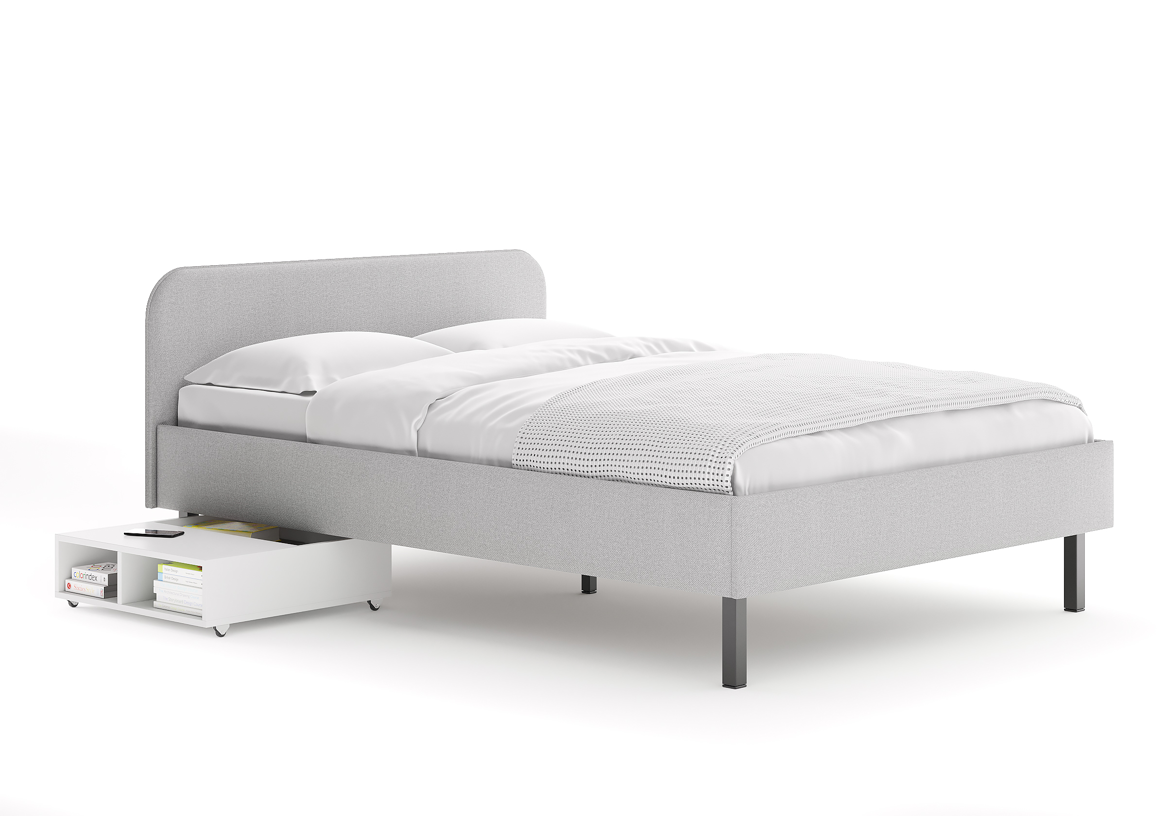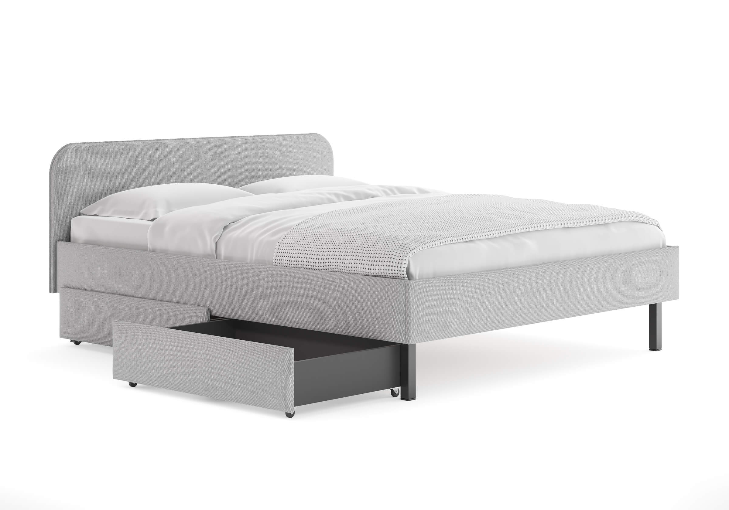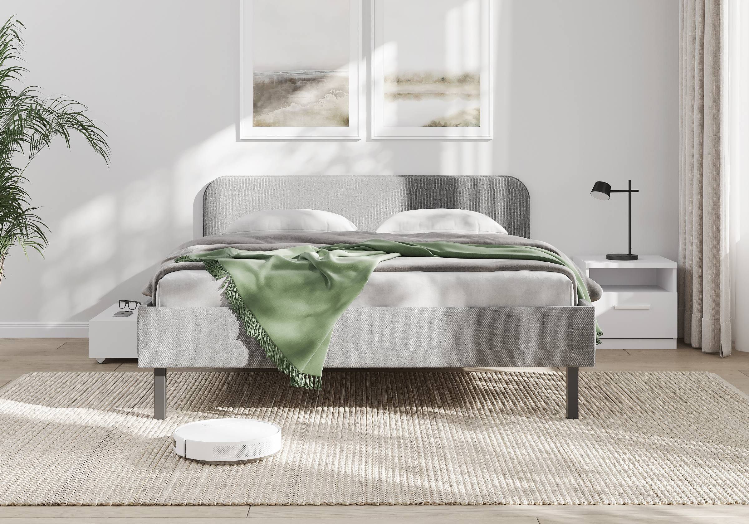Основание кровати на высоких металлических ножках. Благодаря увеличенной высоте позволяют осуществлять легкую уборку под кроватью, даже с помощью робота-пылесоса.