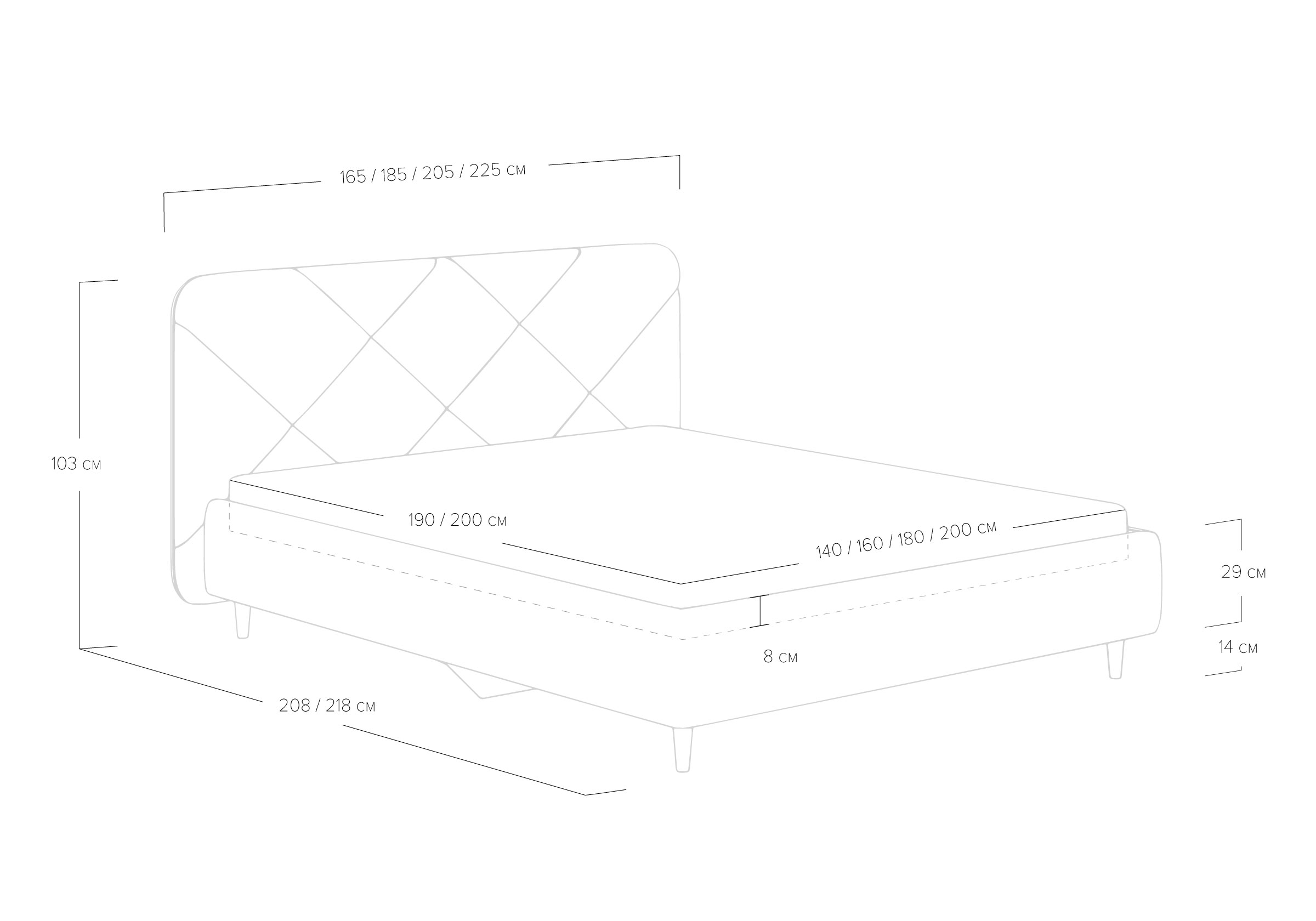 Кровать Taylor выглядит эффектно благодаря изголовью со стежкой в виде крупного абстрактного рисунка. Закругленные углы, объем и мягкость изголовья создадут в вашей спальне атмосферу релакса и уюта. Благодаря высоким опорам из натурального дерева, модель будет смотреться актуально в интерьерах в скандинавском и современном стеле. При необходимости кровать может быть укомплектована разборным или неразборным металлическим основанием с ламелями, подъемным механизмом с бельевым коробом.