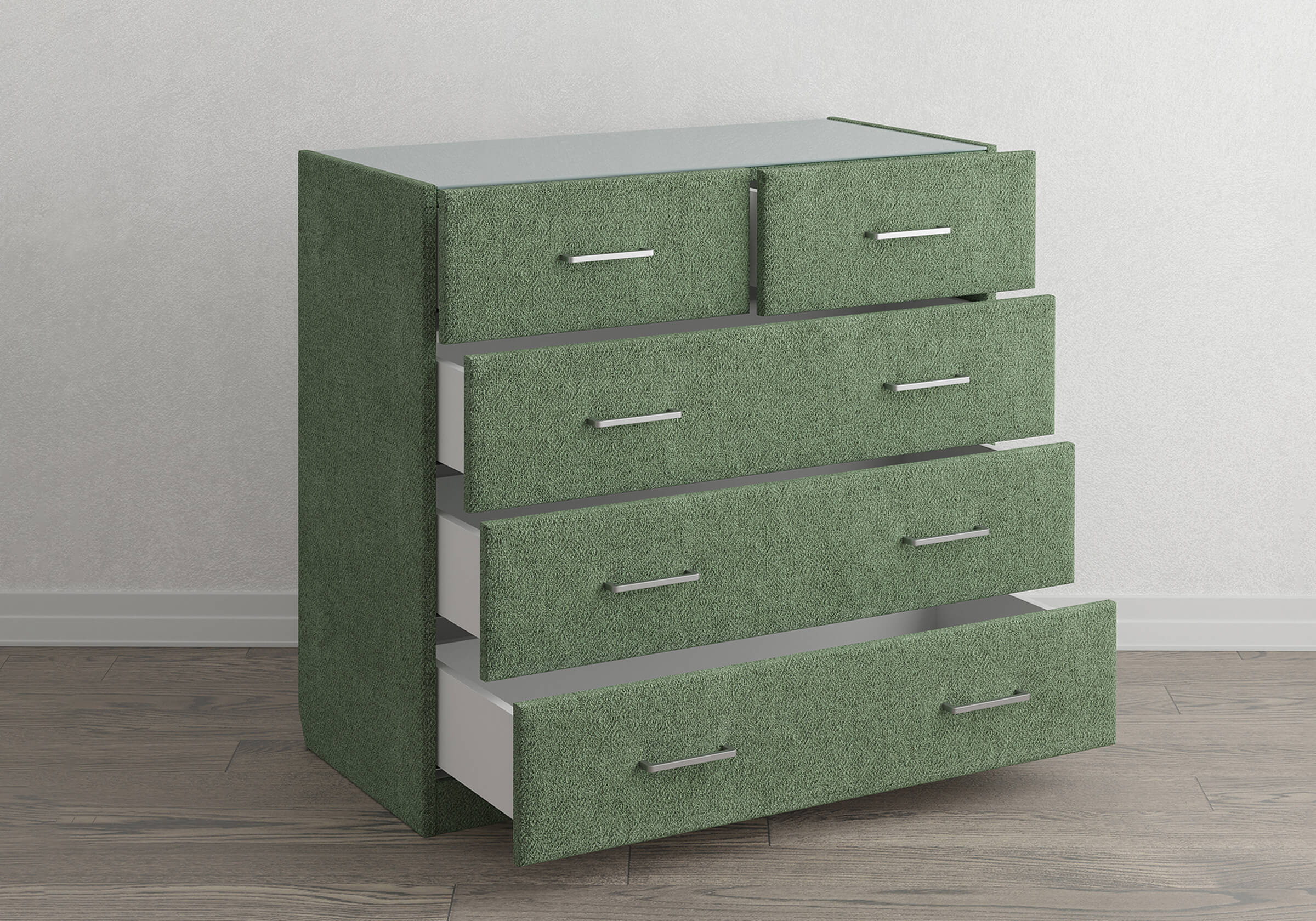 Комод Nolan - универсальная модель, которая отлично подойдет для большинства современных интерьеров. Прямые линии, минималистичная фурнитура, широкий выбор фактур и цветов исполнения. Пять выдвижных ящиков с направляющими скрытого монтажа оснащены доводчиками. Комод дополнительно можно укомплектовать стеклянной столешницей. Для практичности предусмотрен скос под плинтус.