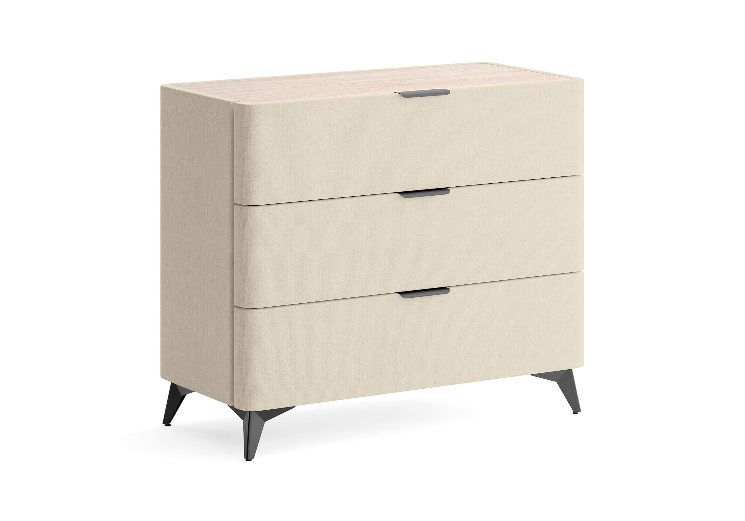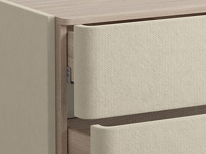 Комод Sheldon — образец слияния функциональности и эстетики. Поверхность, выполненная из ЛДСП в цвете «Дуб Сонома», создает контраст с мягким корпусом. Изящные металлические ручки и высокие металлические ножки подчеркивают его утончённый дизайн. Ящики на скрытых направляющих оснащены доводчиками, обеспечивая мягкое закрывание, а скруглённые углы добавляет стиля и удобства.
