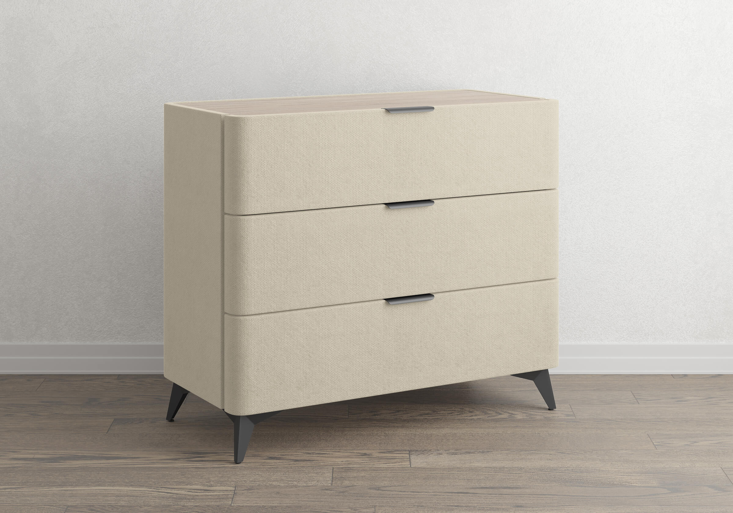 Столешница из ЛДСП - дуб сонома. Сочетается со всеми вариантами обивки комода и повышает уровень практичности.